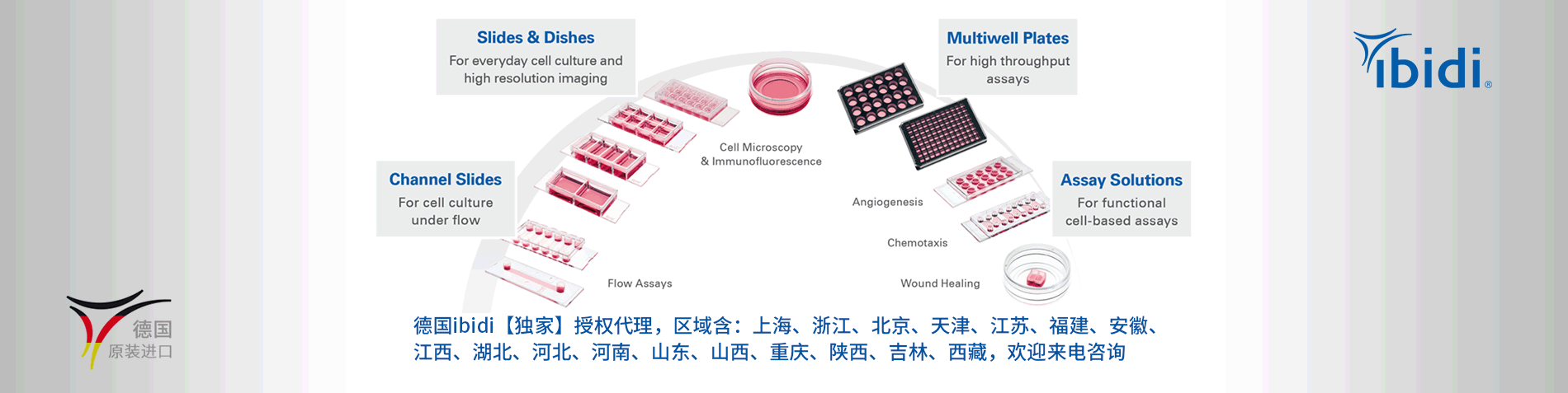 ibidi在細(xì)胞顯微成像領(lǐng)域做出了重大突破,創(chuàng)新細(xì)胞鏡檢解決方案。公司產(chǎn)品囊括范圍較廣,即可實現(xiàn)傳統(tǒng)細(xì)胞培養(yǎng),也可完成復(fù)雜的細(xì)胞實驗(包括血管生成、細(xì)胞趨化、傷口愈合及細(xì)胞灌流等實驗)。